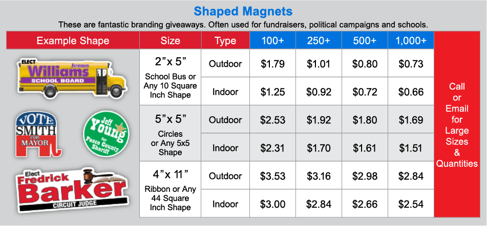 Shaped cut or Rectangle, our Political Magnets are a simple, yet effective way for your supporters to spread your message. Larger magnets on your campaign cars can be placed and removed in a snap. This makes it easy when the campaign message changes from one event to the next! Non-permanent, but with high durability, smaller magnets can also be a unique handout for your supporters.